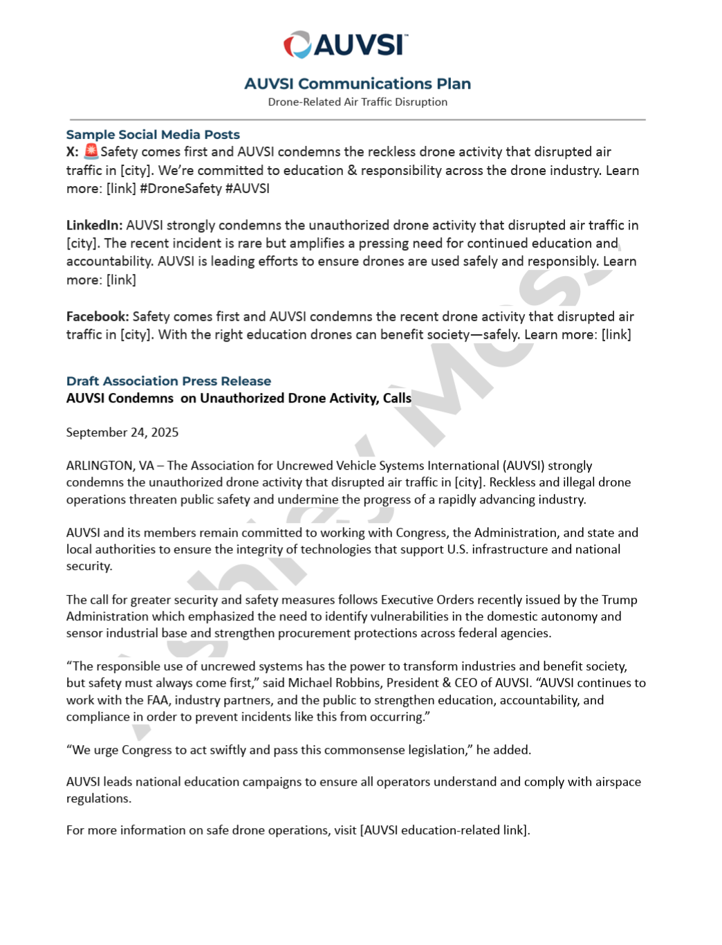 Background: As a communications consultant, my task was to craft a crisis communications plan for the world's largest nonprofit membership organization dedicated to the advancement of uncrewed systems and robotics to respond to an unauthorized air traffic disruption in a major city.